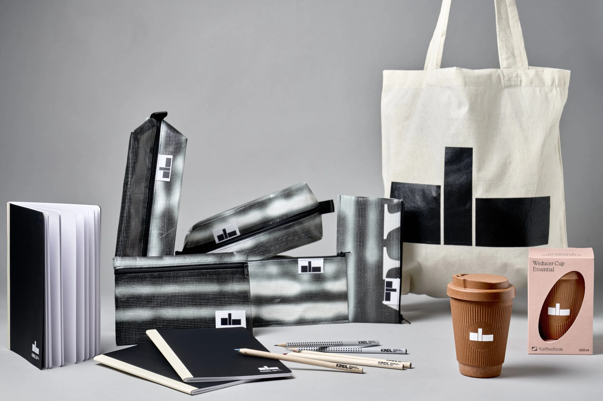 In the foyer of the KINDL, in addition to gift certificates for admission to the exhibitions, catalogues, posters, and tote bags, we recently began offering limited-edition works by artists from our programme, sketchbooks, pens, T-shirts, and coffee mugs for sale. The zippered cases made from recycled banners from our facade after the exhibitions have ended are truly one of a kind.